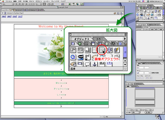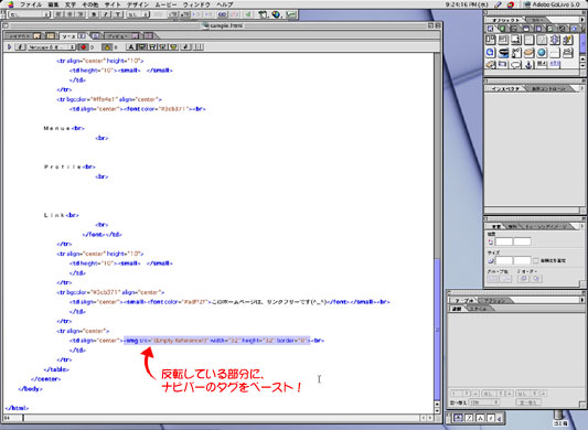 使用しているHP作成ソフト(ここではGoLive)を起動して、ご自分のHPでナビバーを貼りたいページのファイルを開きます。