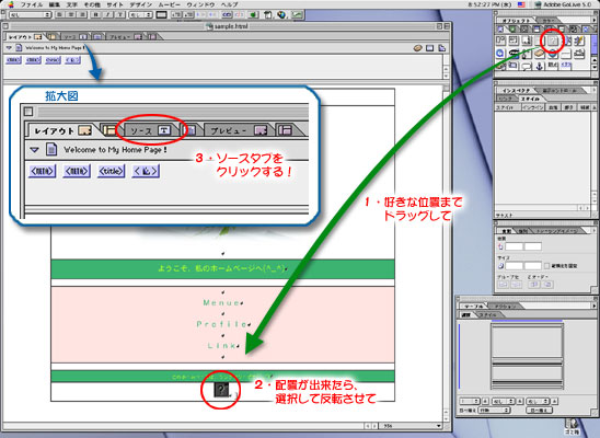 配置した画像オブジェクトをマウスでなぞって反転させて選択してから、勇気をだして「ソース」を開いて下さい。(ソースタブをクリックします。)